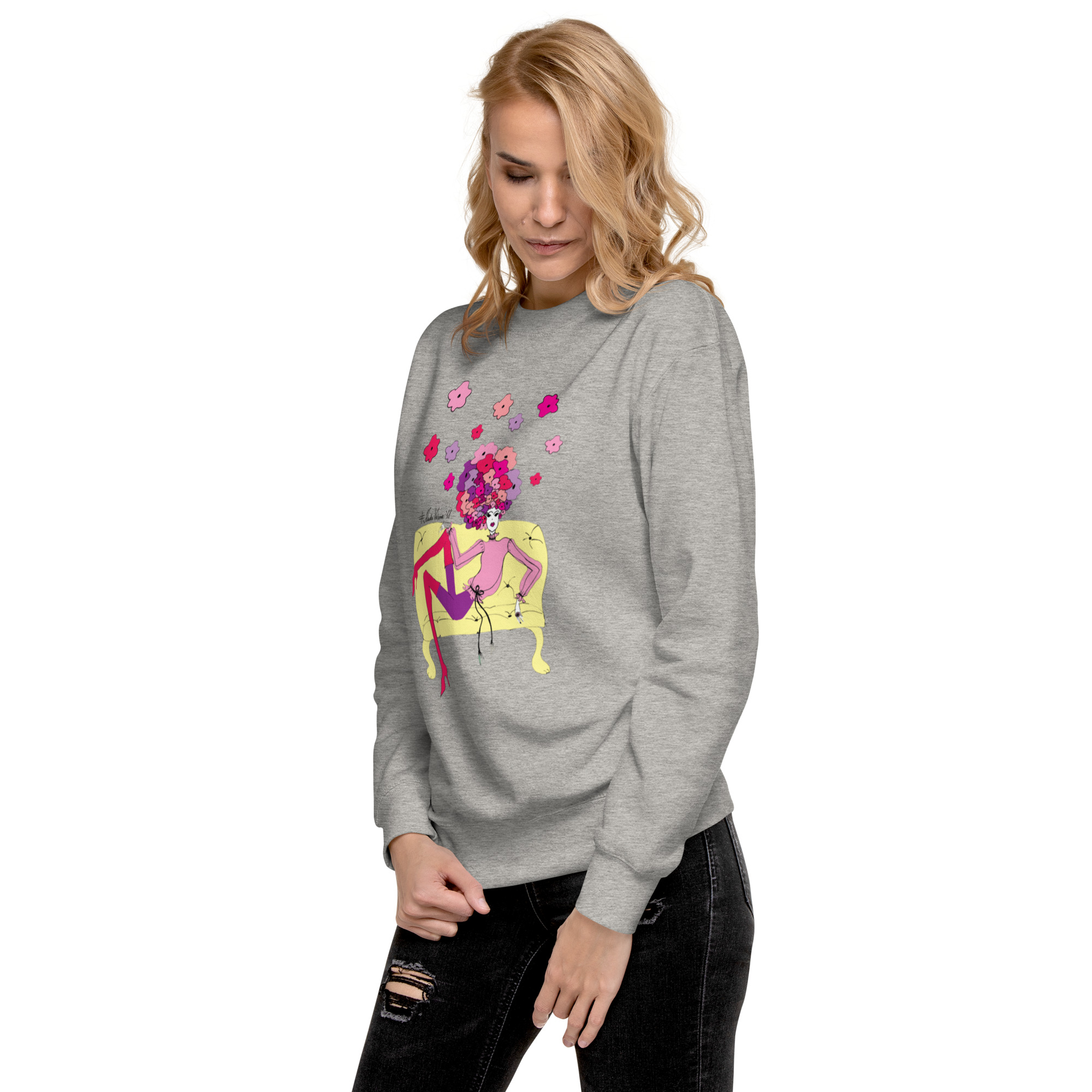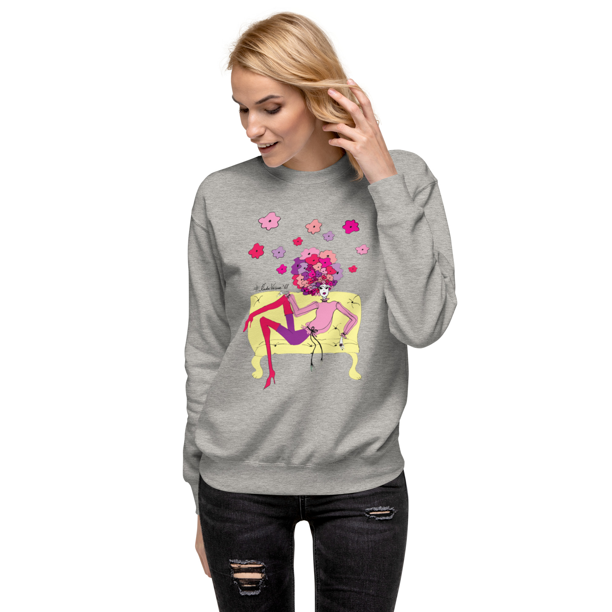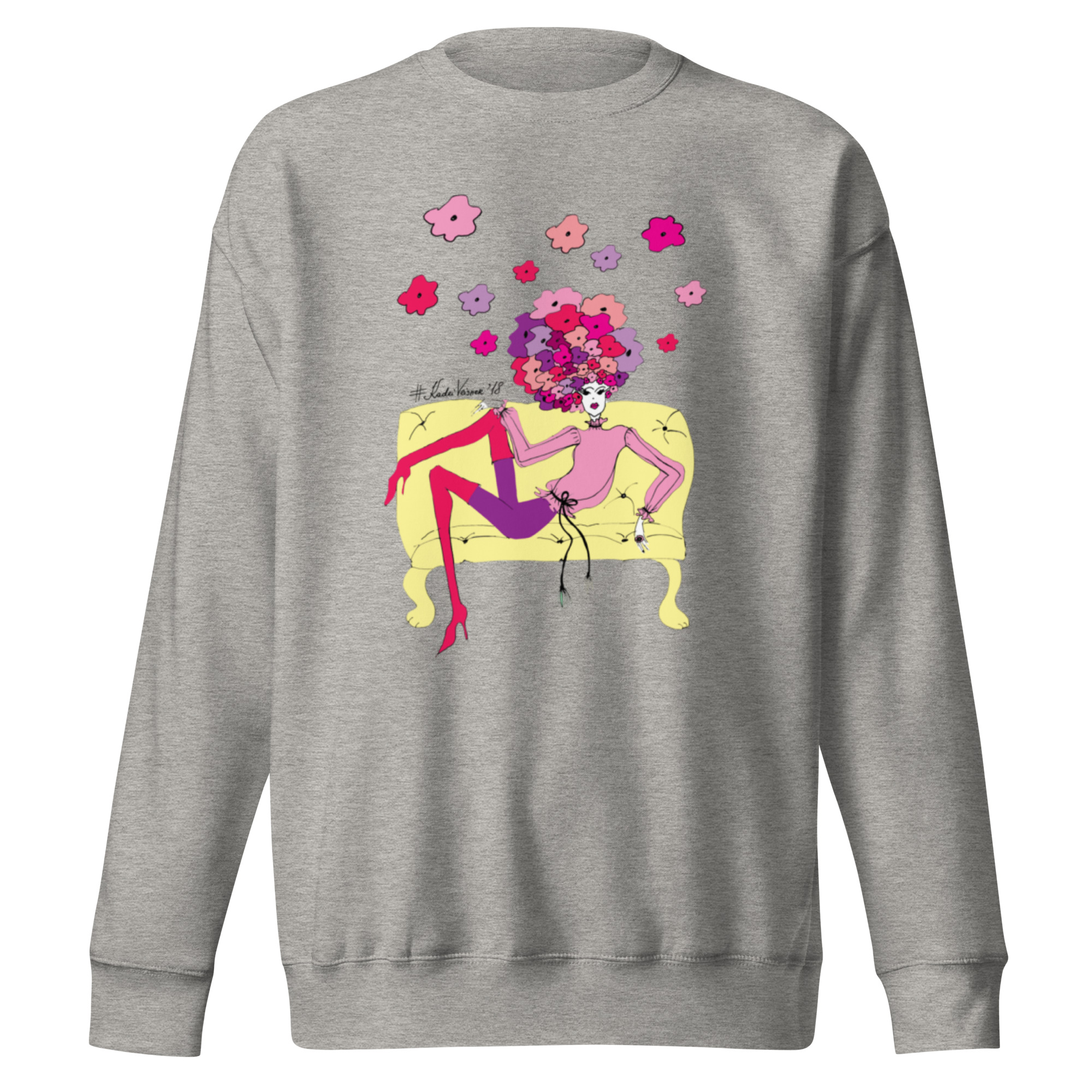 Kadri Veisneri autorilooming- “Lillepea diivanil” oli esimene pilt, mis jõudis nii t-särgi kui ka pusa peale. See on olnud siiani üks populaarsemaid pilte lisaks suurele “Lillepeale” ja “Moonipeale”. Sobib kanda igal aastaajal, hall toon toob lilled meeldivalt esile ning annab igale outfitile naiselikkust ning värskust juurde. Olen tänulik, kui toetad Eesti kunsti, sest t-särk on joonistatud, kujundatud ja trükitud meie oma kohalike tegijate poolt.